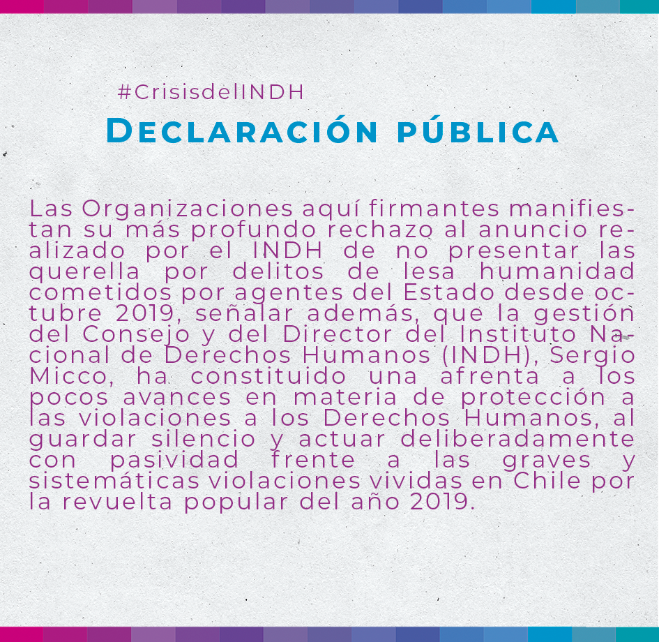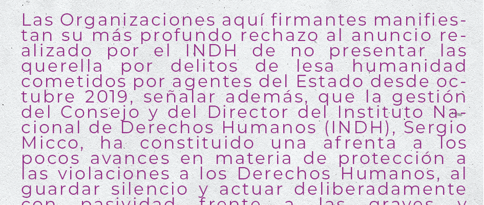 (Santiago de Chile, 24 de mayo de 2022).-Las Organizaciones aquí firmantes manifiestan su más profundo rechazo al anuncio realizado por el INDH de no presentar las querella por delitos de lesa humanidad cometidos por agentes del Estado desde octubre 2019, señalar además, que la gestión del Consejo y del Director del Instituto Nacional de Derechos Humanos (INDH), Sergio Micco, ha constituido una afrenta a los pocos avances en materia de protección a las violaciones a los Derechos Humanos, al guardar silencio y actuar deliberadamente con pasividad frente a las graves y sistemáticas violaciones vividas en Chile por la revuelta popular del año 2019.