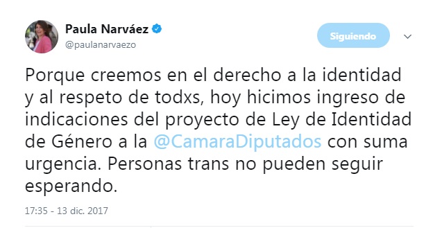 La Ministra Narváez ingresó también nuevas indicaciones a la LIG, en la que se incorporará a niñes y adolescentes trans; garantizará la privacidad de las personas trans en el ámbito de las inscripciones y rectificaciones de nombre y sexo; eliminará cualquier requisito patologizante para el cambio de nombre y sexo registral; y permitirá que las personas trans, que modifiquen su identidad legal, puedan seguir casadas cuando exista el vínculo de ambos cónyuges. Se acordó además un calendario de tres sesiones antes de fin de año para que en enero se inicie la discusión de las indicaciones.