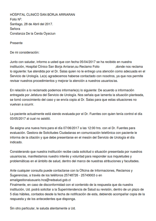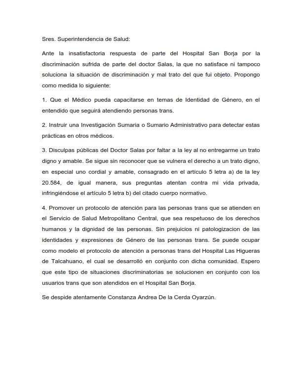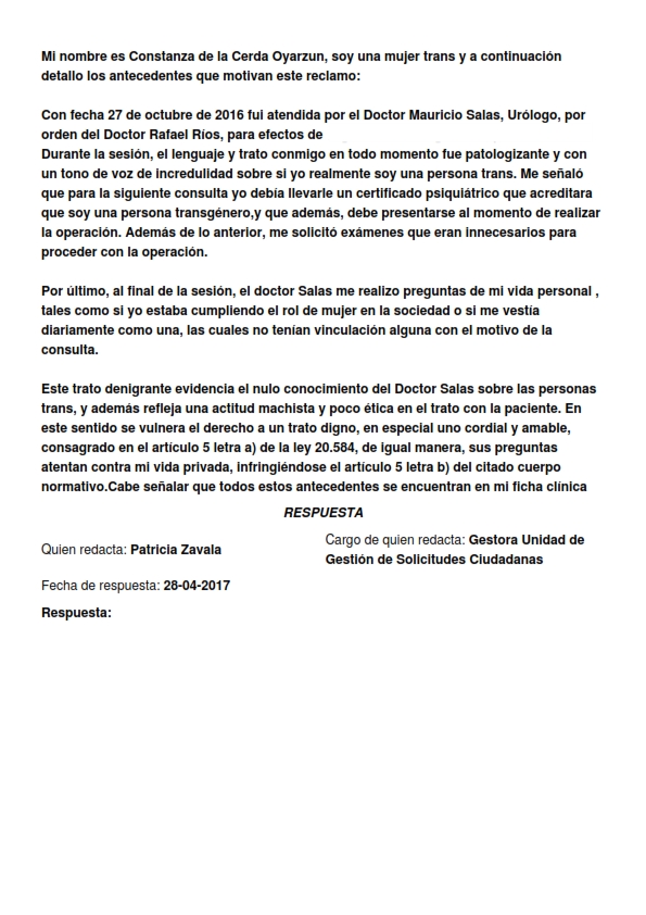 En octubre de 2016 la paciente trans Constanza Andrea De la Cerda, usuaria del Hospital San Borja Arriarán, fue víctima de malos tratos y requisitos abusivos por parte del urólogo Mauricio Salas. “Empezó a pedirme un certificado psiquiátrico para atenderme y que el día de la operación tenía que llevárselo, fue un trato denigrante, me sentí por primera vez como enferma”, cuenta.