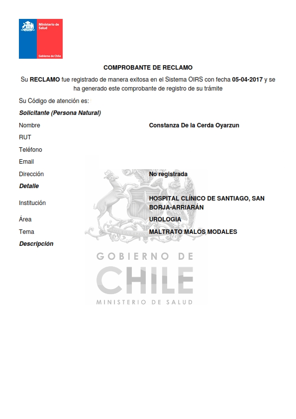 En ese momento escribió un reclamo en la OIRS del centro hospitalario en el que se deja constancia de que el médico realizó cuestionamientos a su identidad y expresión de género, además de preguntas sobre su vida personal que nada tenían que ver con el motivo de la consulta. Quedó por escrito en la ficha clínica la exigencia de un certificado psiquiátrico de disforia de género antes de continuar con la atención de salud.