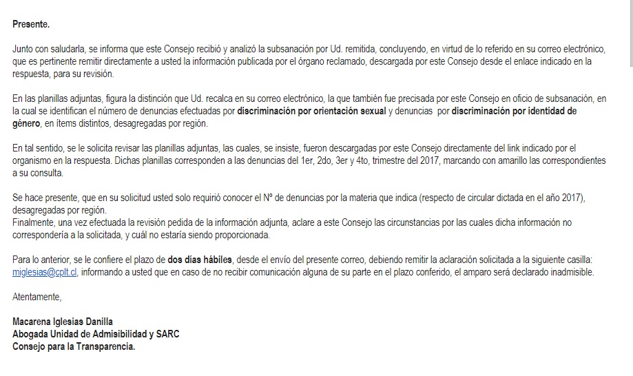 La respuesta del organismo público fue el envío de un enlace con las estadísticas de denuncia, especificando que no cuentan con un item para la Circular y que estaban dentro del apartado “discriminación por orientación sexual”. Como solicitantes, pedimos al Consejo de Transparencia que revisara el caso, explicando que la identidad de género es diferente a la orientación sexual de una persona.
