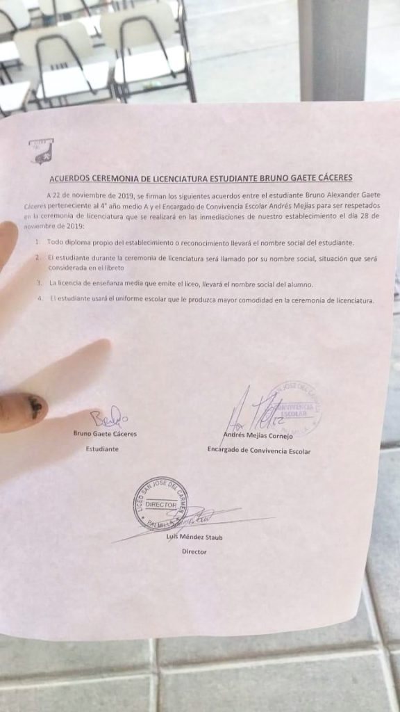 When it was believed that it was not possible that Bruno would graduate with his social name, on November 22nd, he sent Franco Fuica the photography of a document where it reads an agreement that had been signed with the person in charge of school coexistence of the school San José del Carmen, that establishes to respect the following points in the graduation ceremony of November 28th: