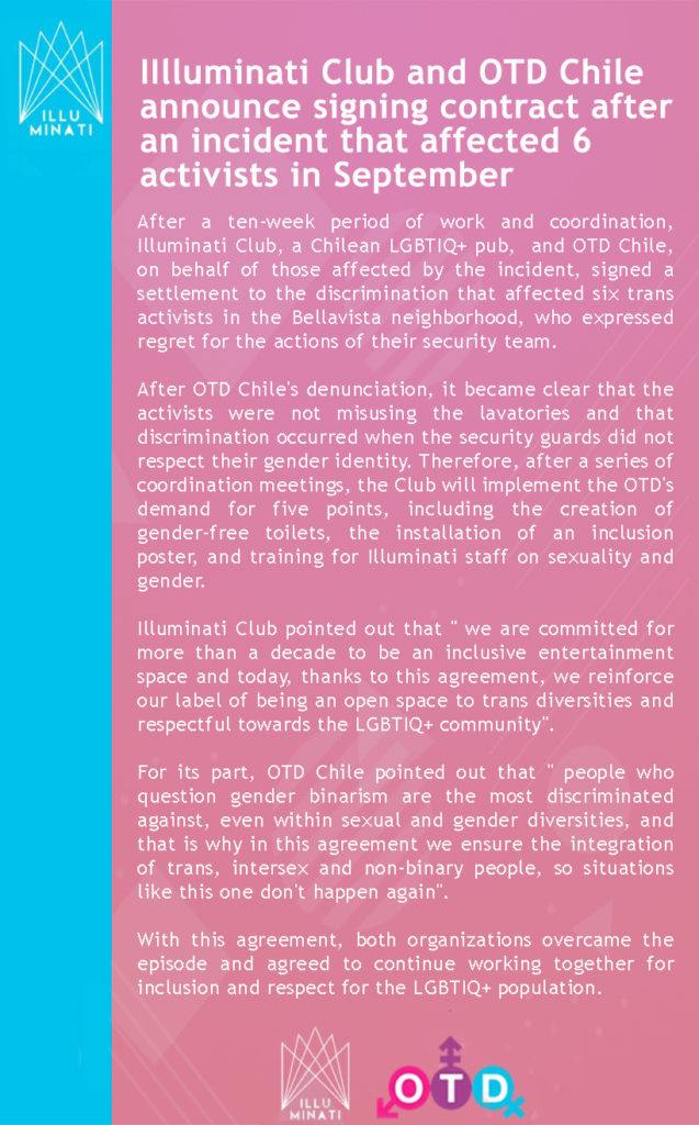 After a ten-week period of work and coordination, Illuminati Club, a Chilean LGBTIQ+ pub, and OTD Chile, on behalf of those affected by the incident, signed a settlement to the discrimination that affected six trans activists in the Bellavista neighborhood, who expressed regret for the actions of their security team.